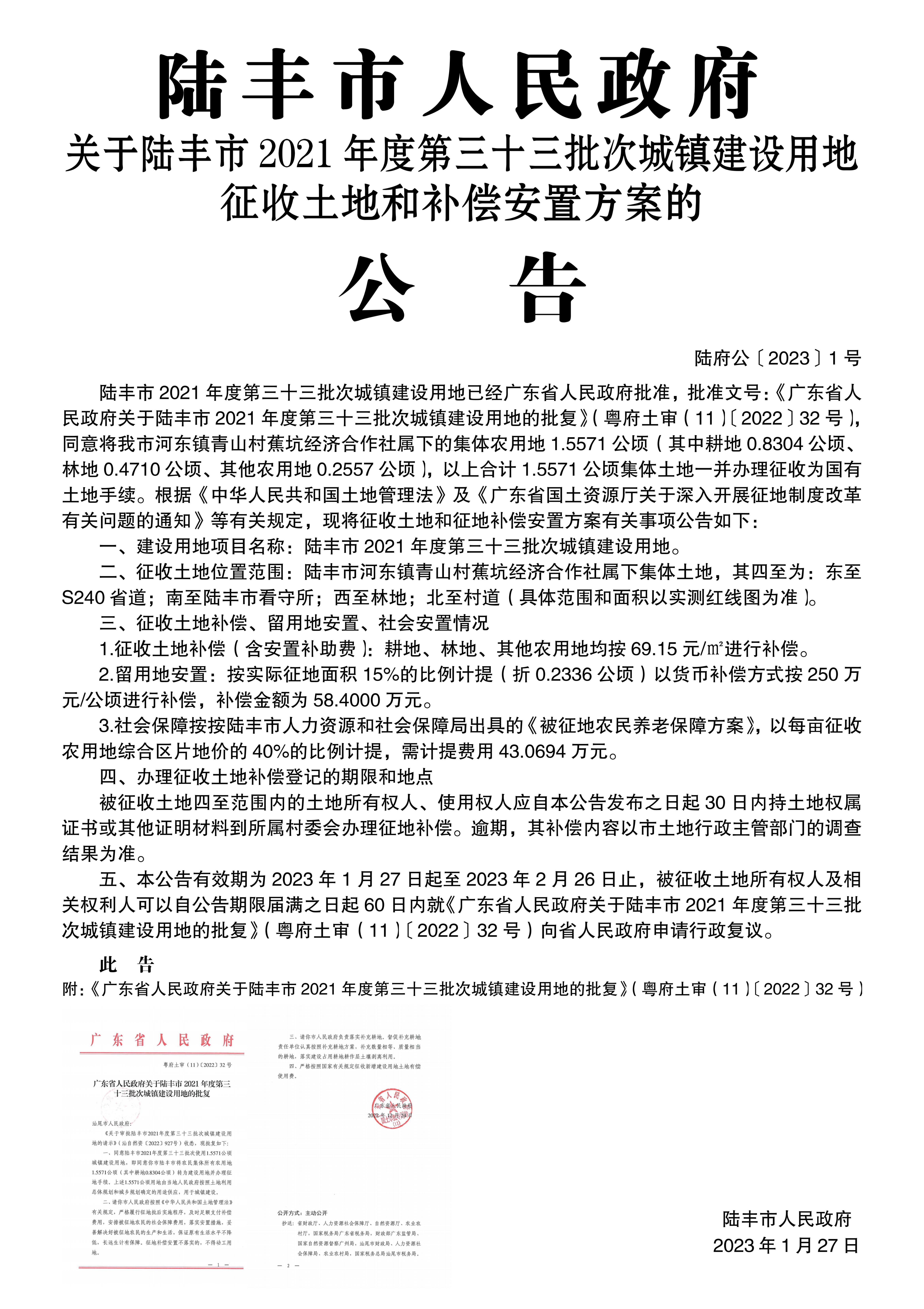 廣東省人民政府關(guān)于陸豐市2021年度第三十三批次城鎮(zhèn)建設(shè)用地的批復(fù)(粵府土審(11)〔2022〕32號)