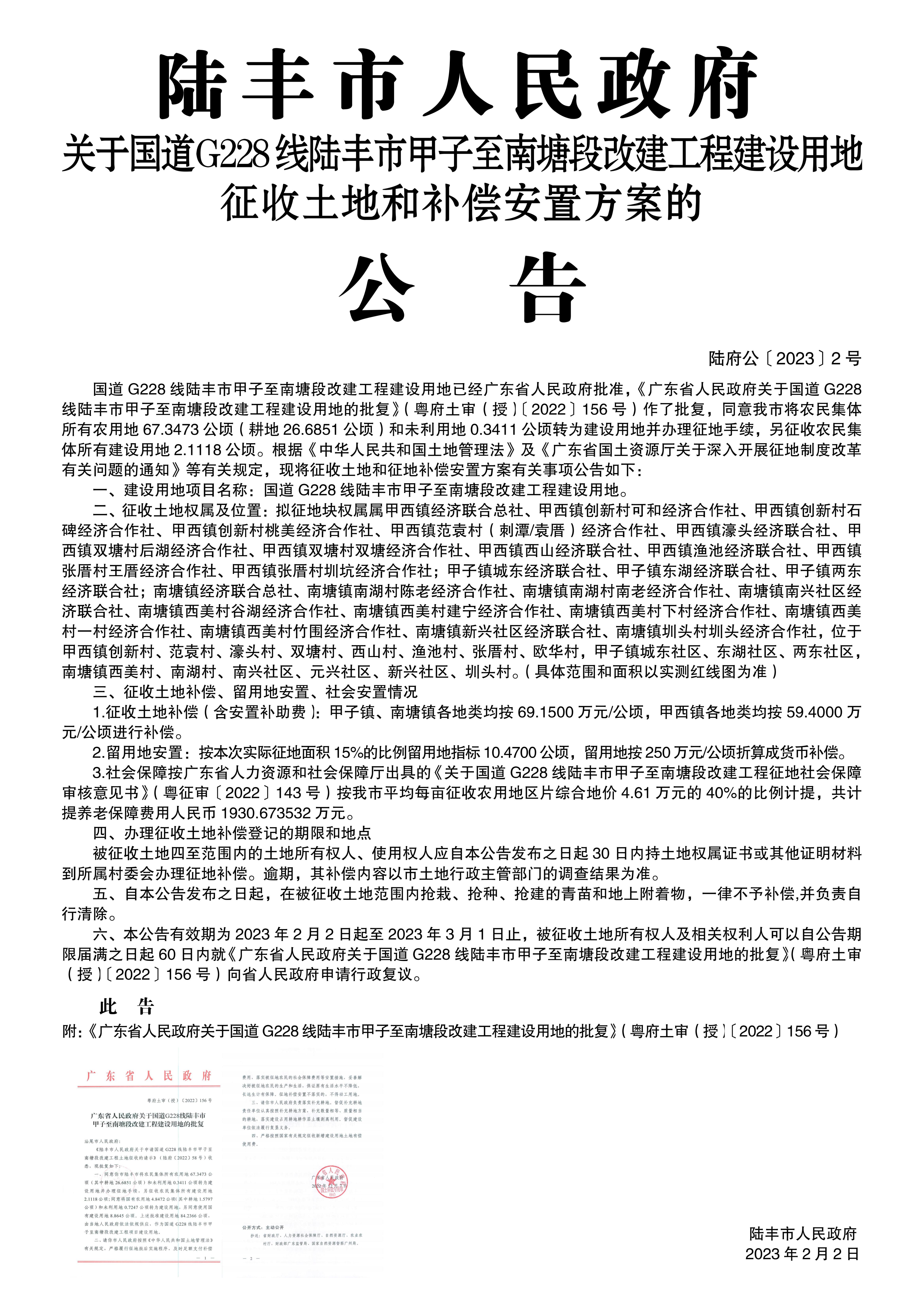 廣東省人民政府關(guān)于國道G228線陸豐市甲子至南塘段改建工程建設(shè)用地的批復(fù)(粵府土審(授)〔2022〕156號)