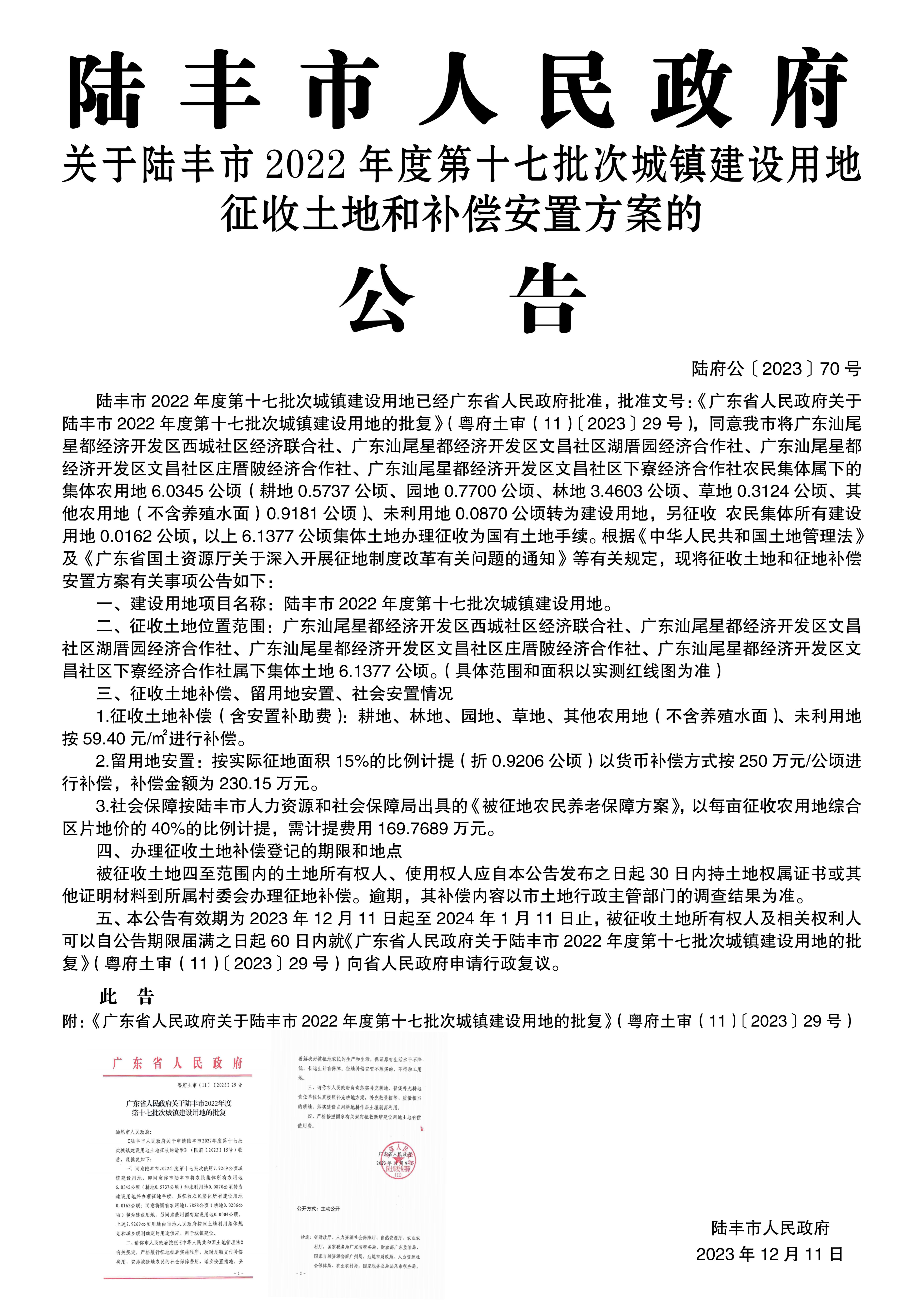 廣東省人民政府關(guān)于陸豐市 2022年度第十七批次城鎮(zhèn)建設(shè)用地的批復(fù)(粵府土審(11)〔2023〕29號)