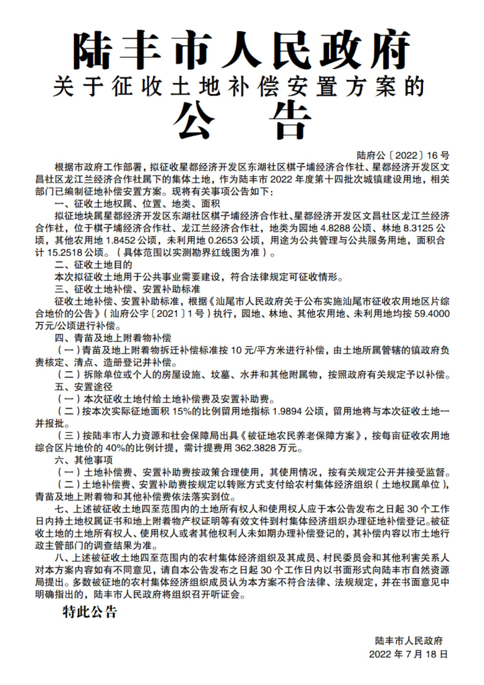 陸豐市人民政府關(guān)于征收土地補(bǔ)償安置方案的公告(陸府公[2022]16號(hào))