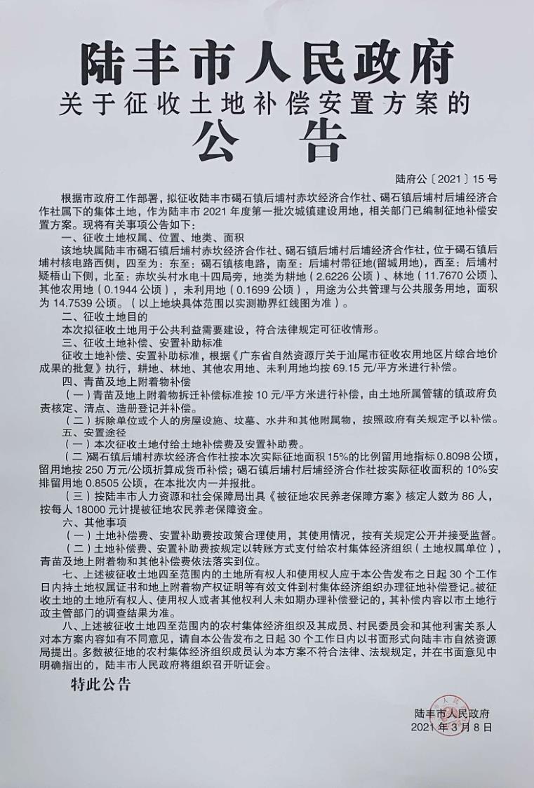 陸豐市人民政府關于征收土地和補償安置方案的公告(陸府公[2021]15號)