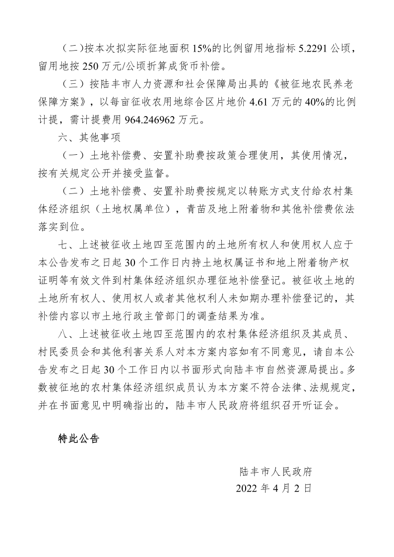 陸豐市人民政府關(guān)于征收土地補(bǔ)償安置方案的公告(陸府公〔2022〕8 號)