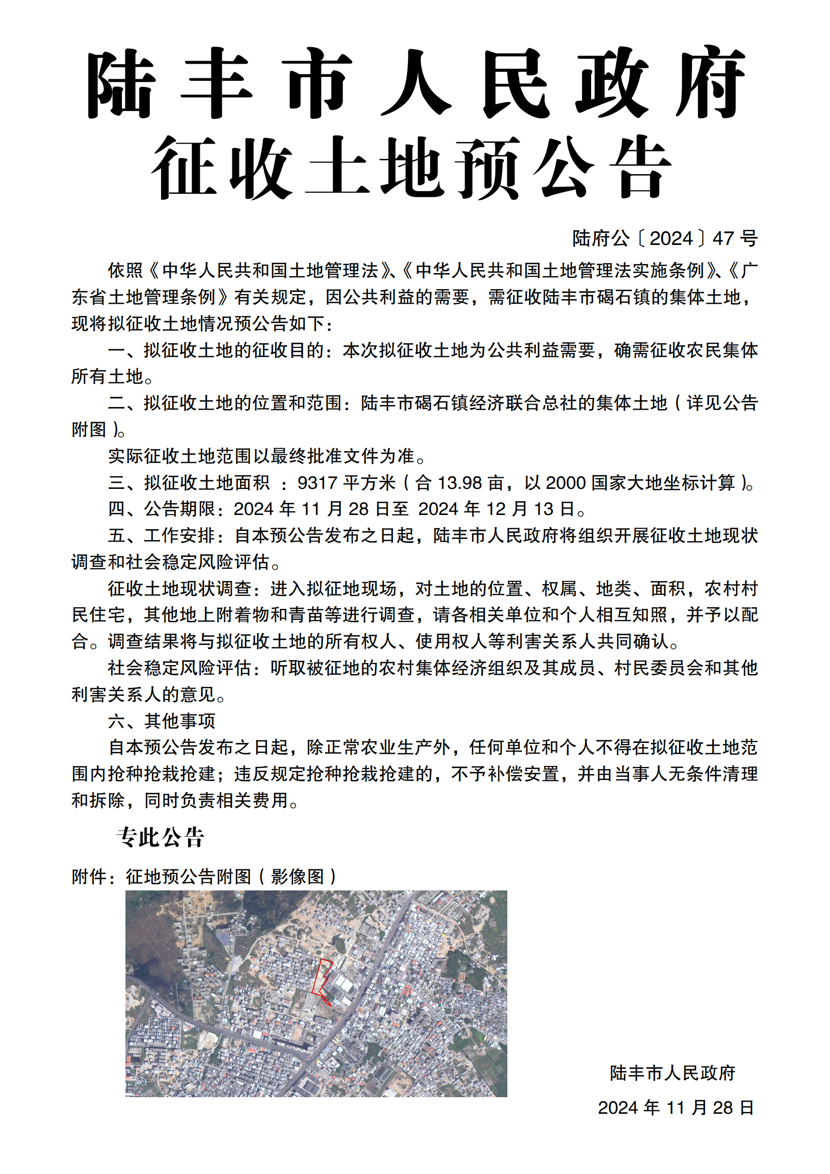 陸豐市人民政府關(guān)于征收土地預公告(陸府公〔2024〕47號)