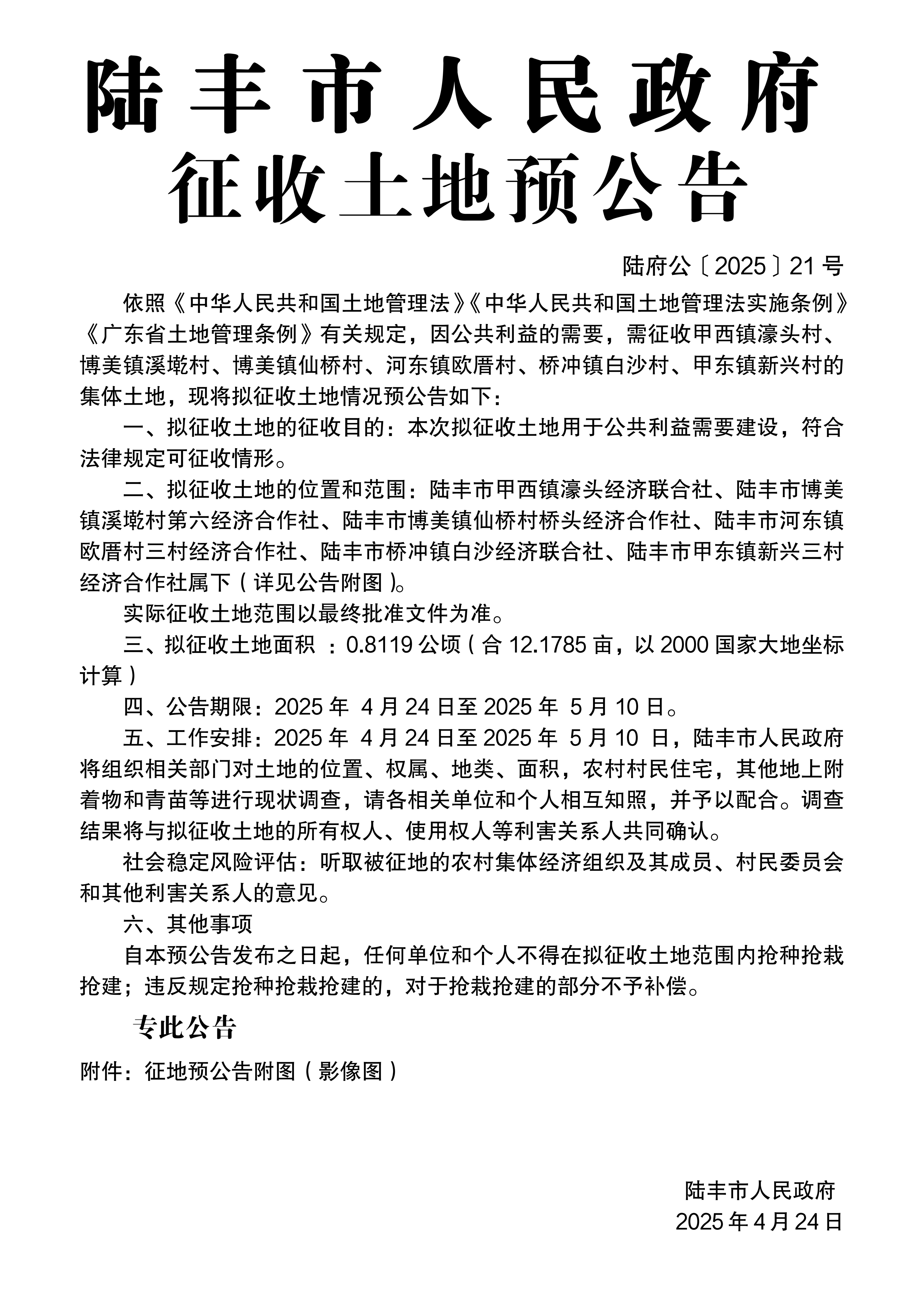 陸豐市人民政府關(guān)于征收土地預(yù)公告(陸府公〔2025〕21號(hào))