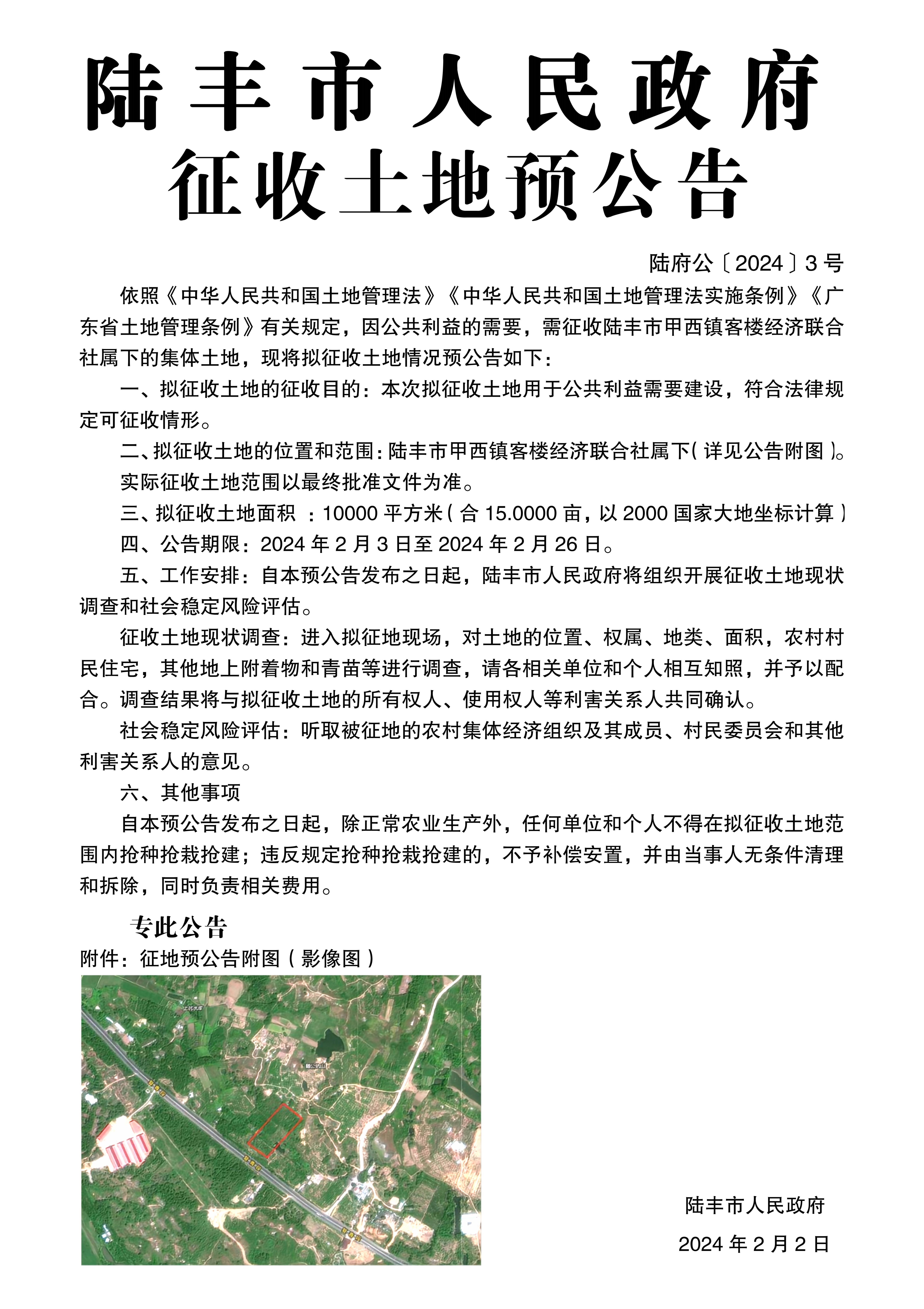 陸豐市人民政府征收土地預公告(陸府公〔2024〕3號)