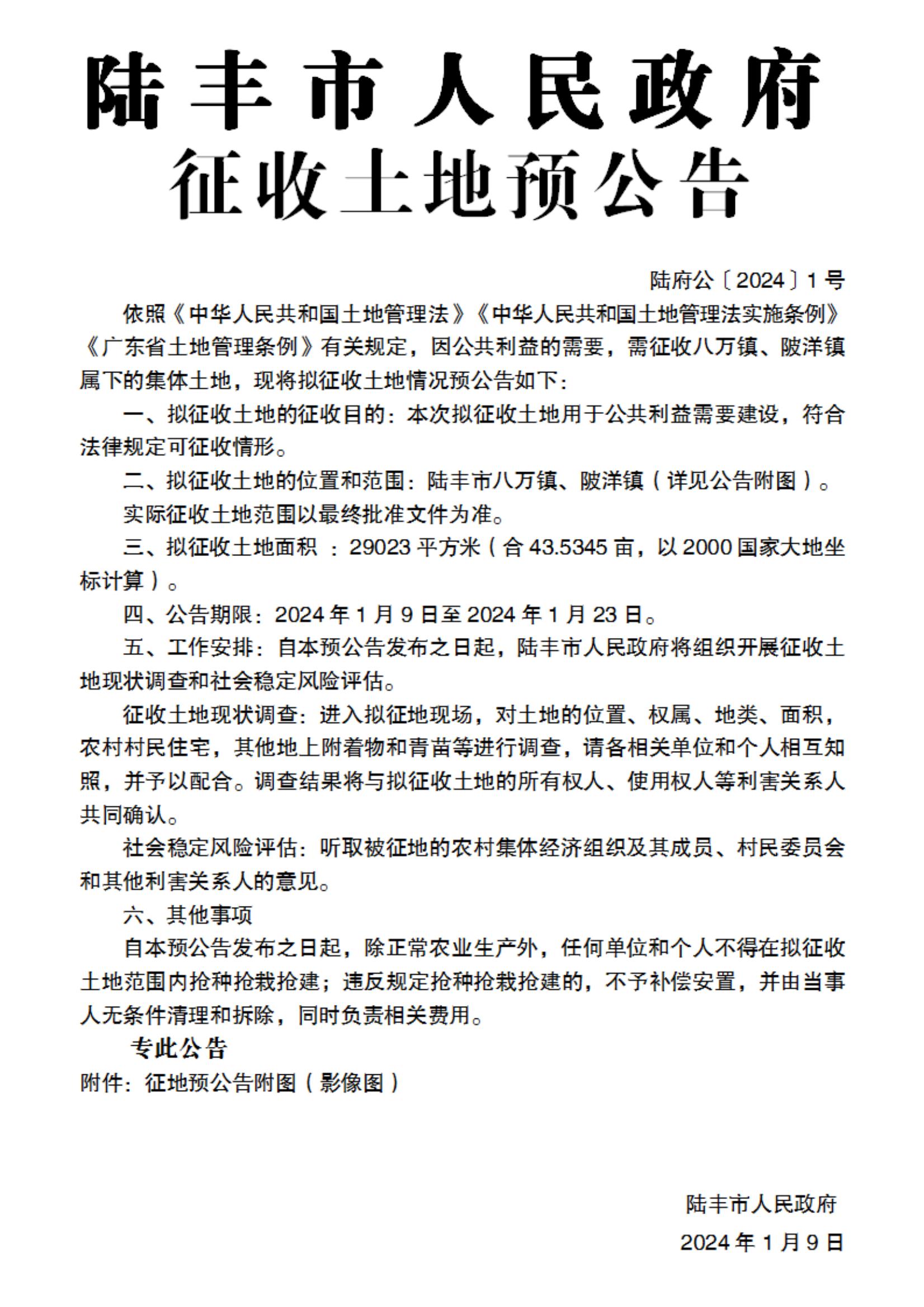 陸豐市人民政府關(guān)于征收土地預(yù)公告(陸府公〔2024〕1號)