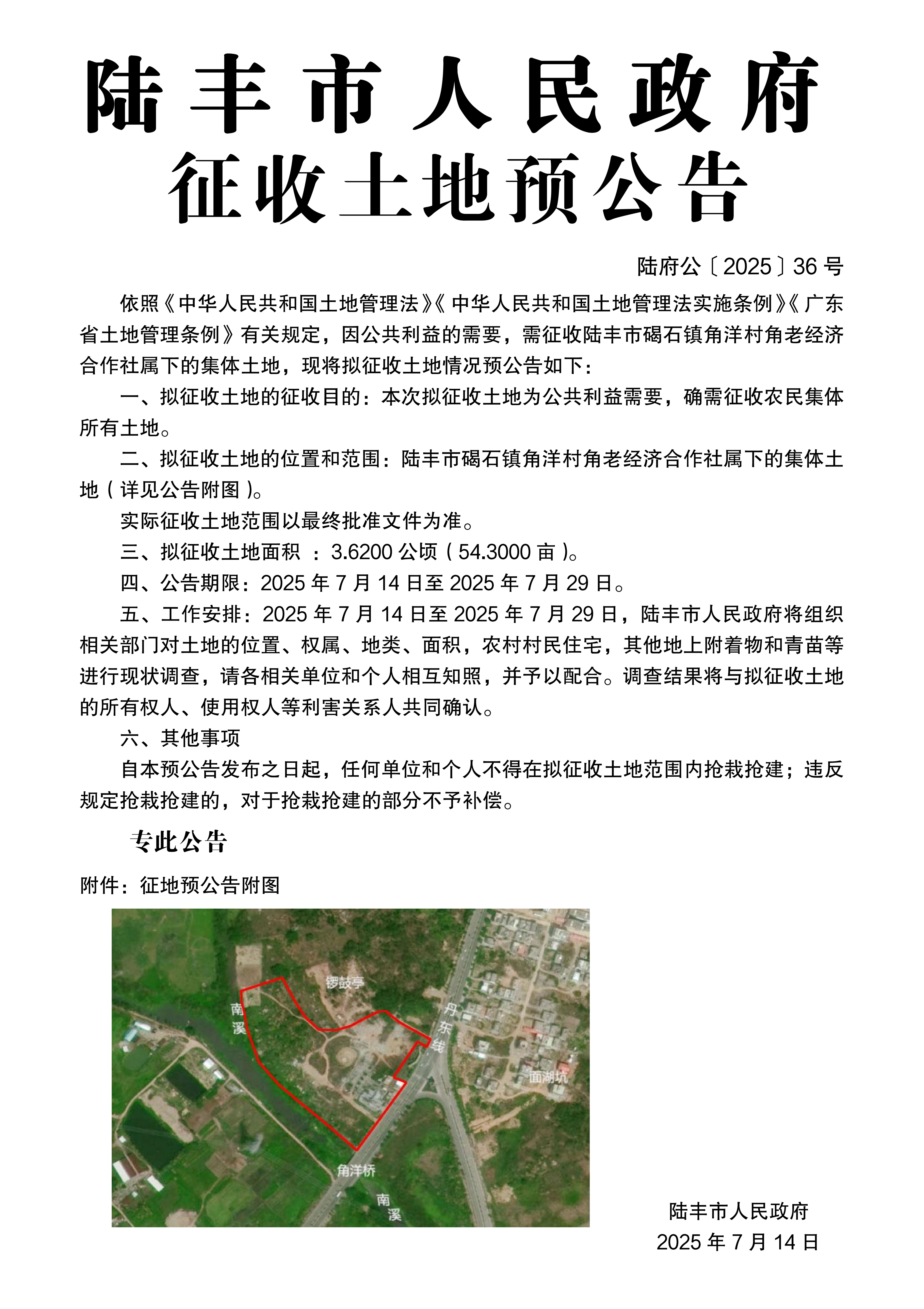 陸豐市人民政府關(guān)于征收土地預(yù)公告(陸府公〔2025〕36號(hào))