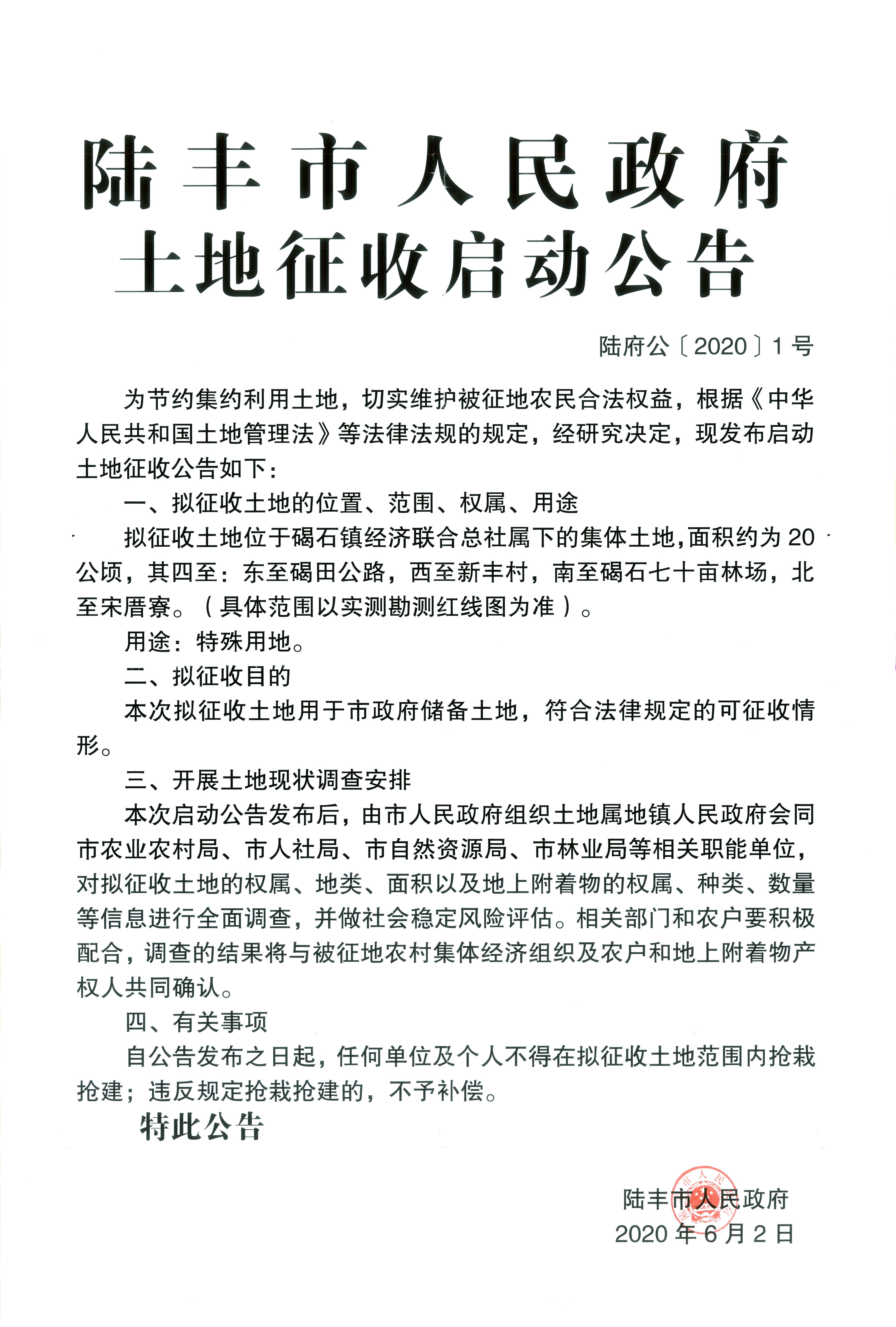 陸豐市人民政府土地征收啟動(dòng)公告(陸府公(2020)1號(hào))