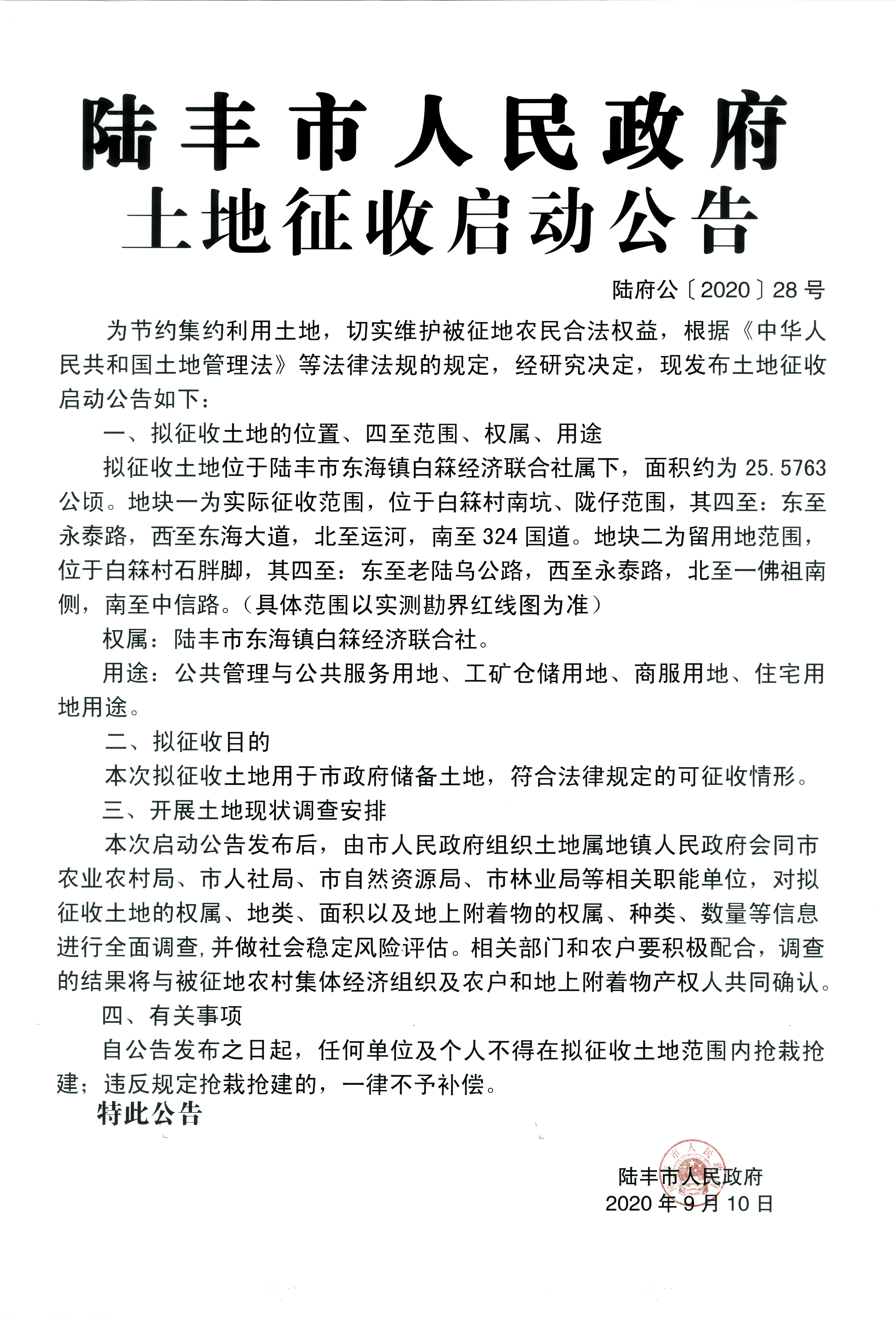 陸豐市人民政府土地征收啟動(dòng)公告-陸府公(2020)28號(hào)