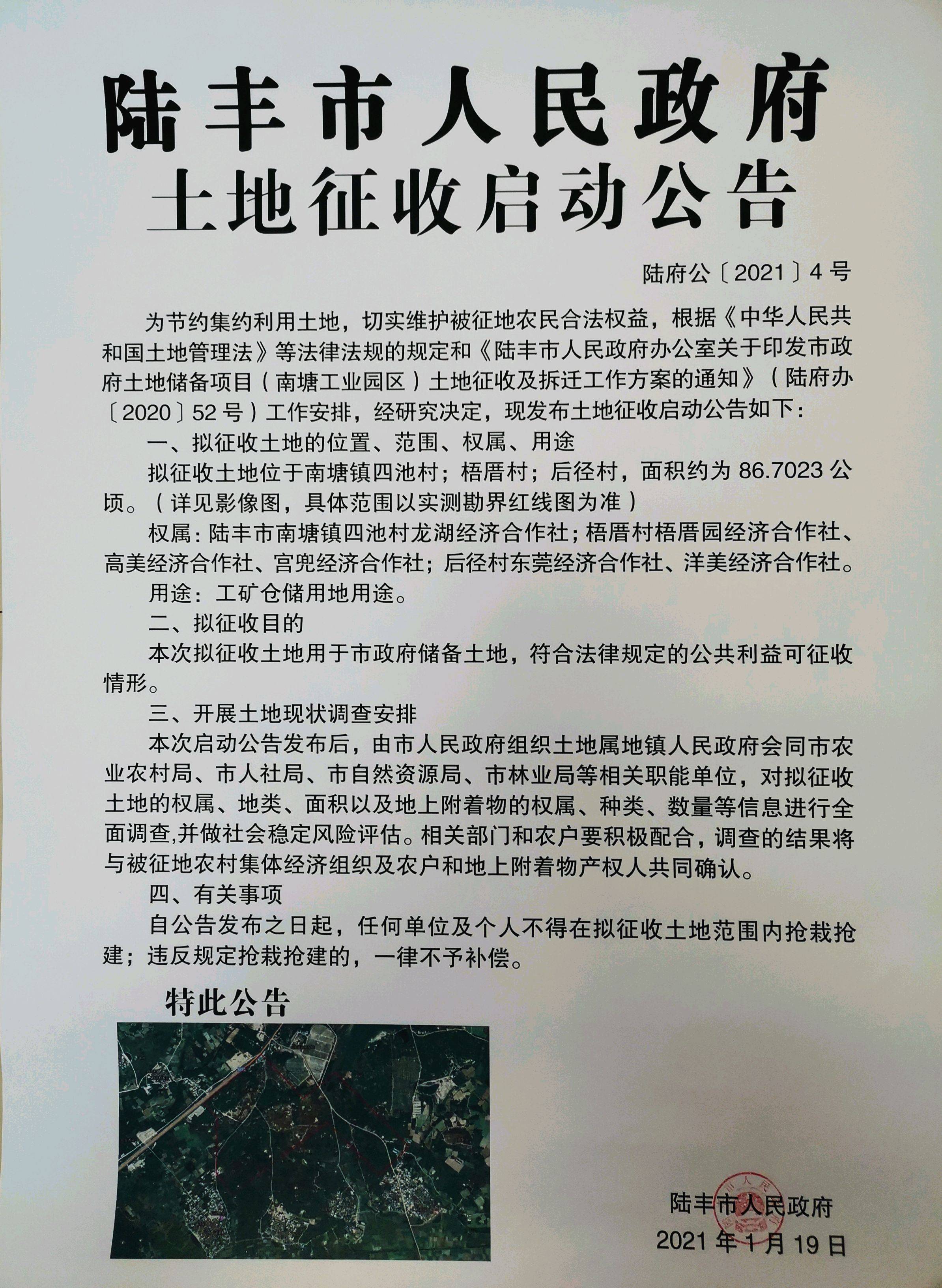 陸豐市人民政府土地征收啟動公告(陸府公[2021]4號)