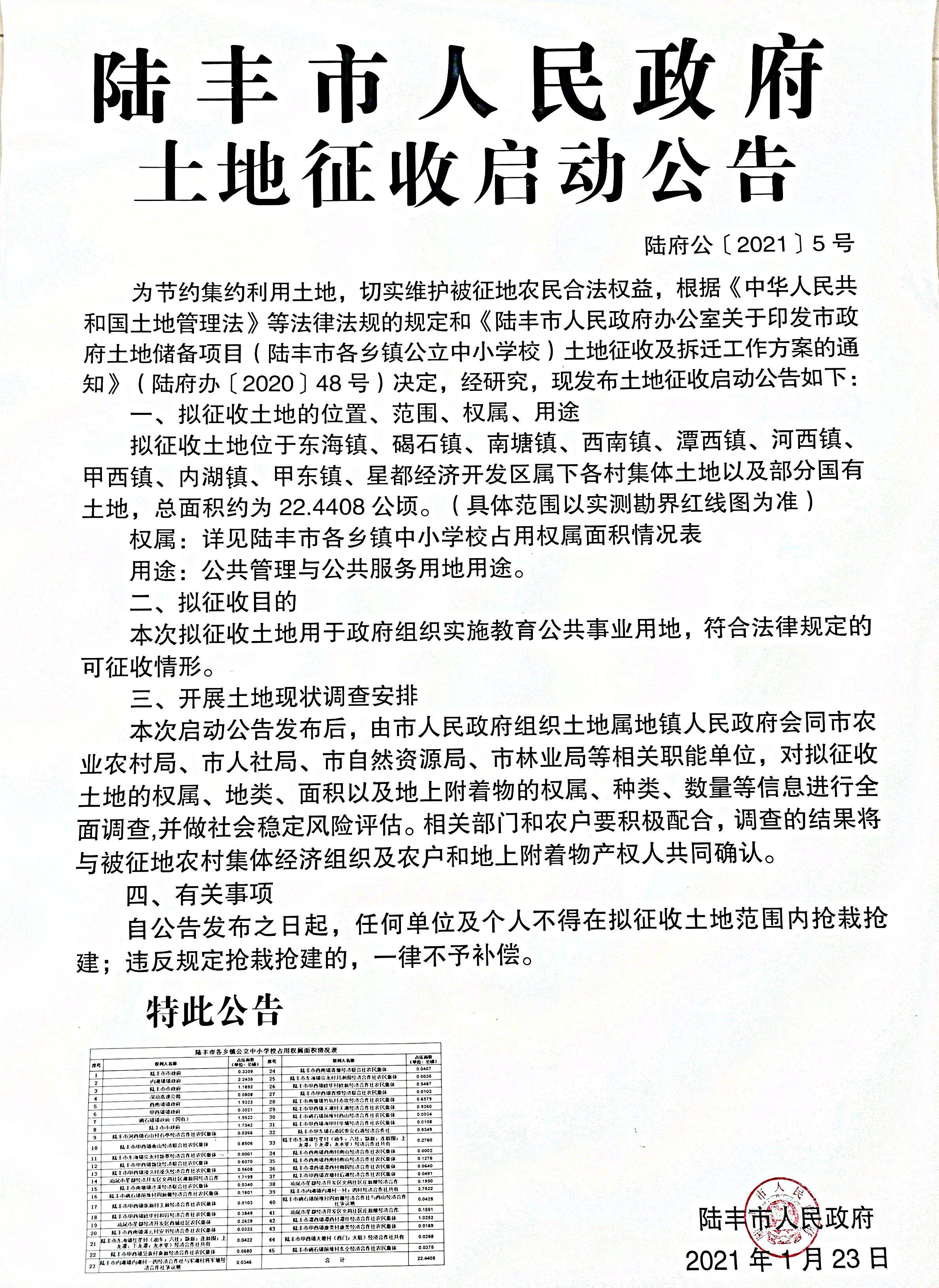陸豐市人民政府土地征收啟動(dòng)公告(陸府公[2021]5號(hào))