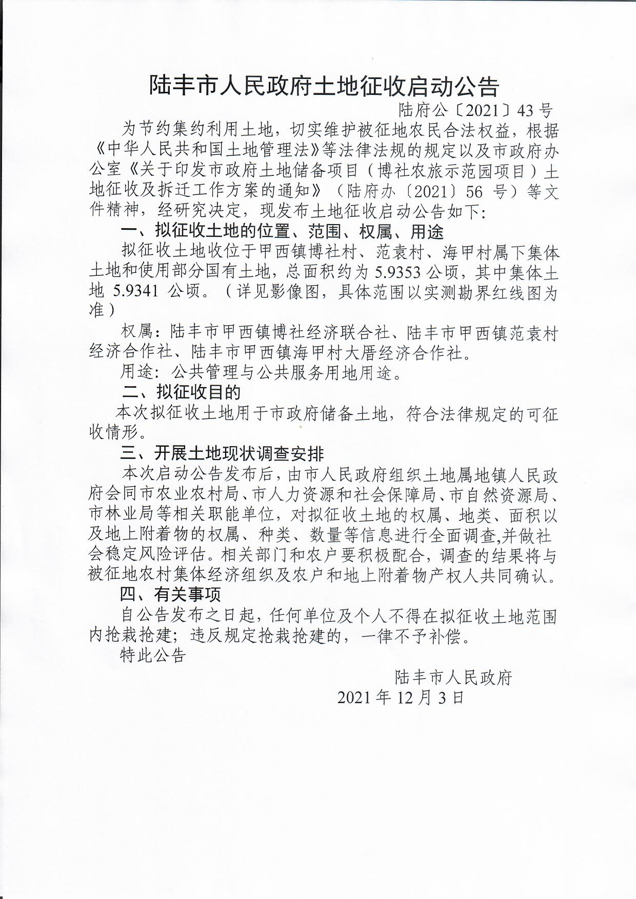 陸豐市人民政府土地征收啟動公告(陸府公[2021]43號)