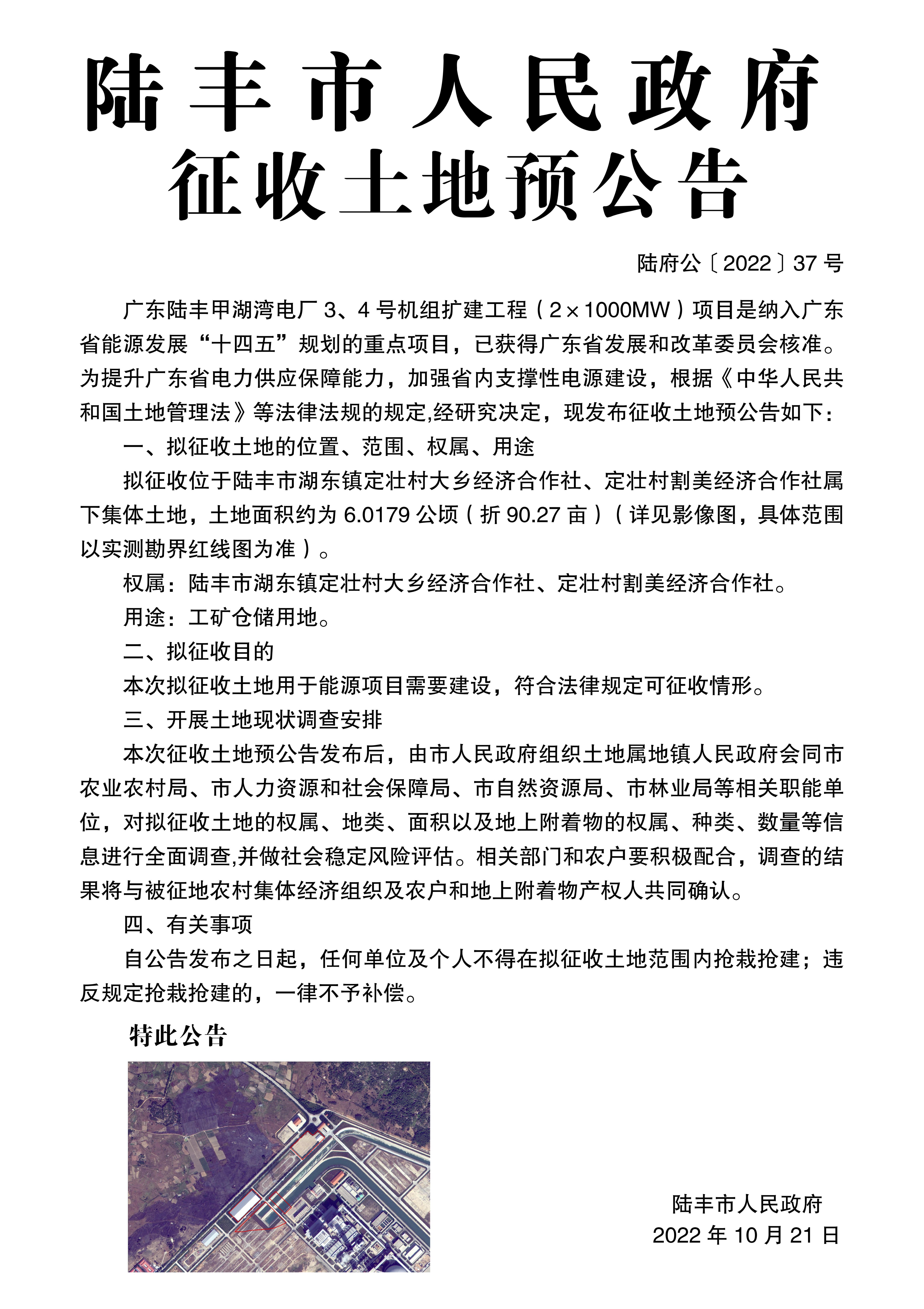 陸豐市人民政府征收土地預公告(陸府公[2022]37號)