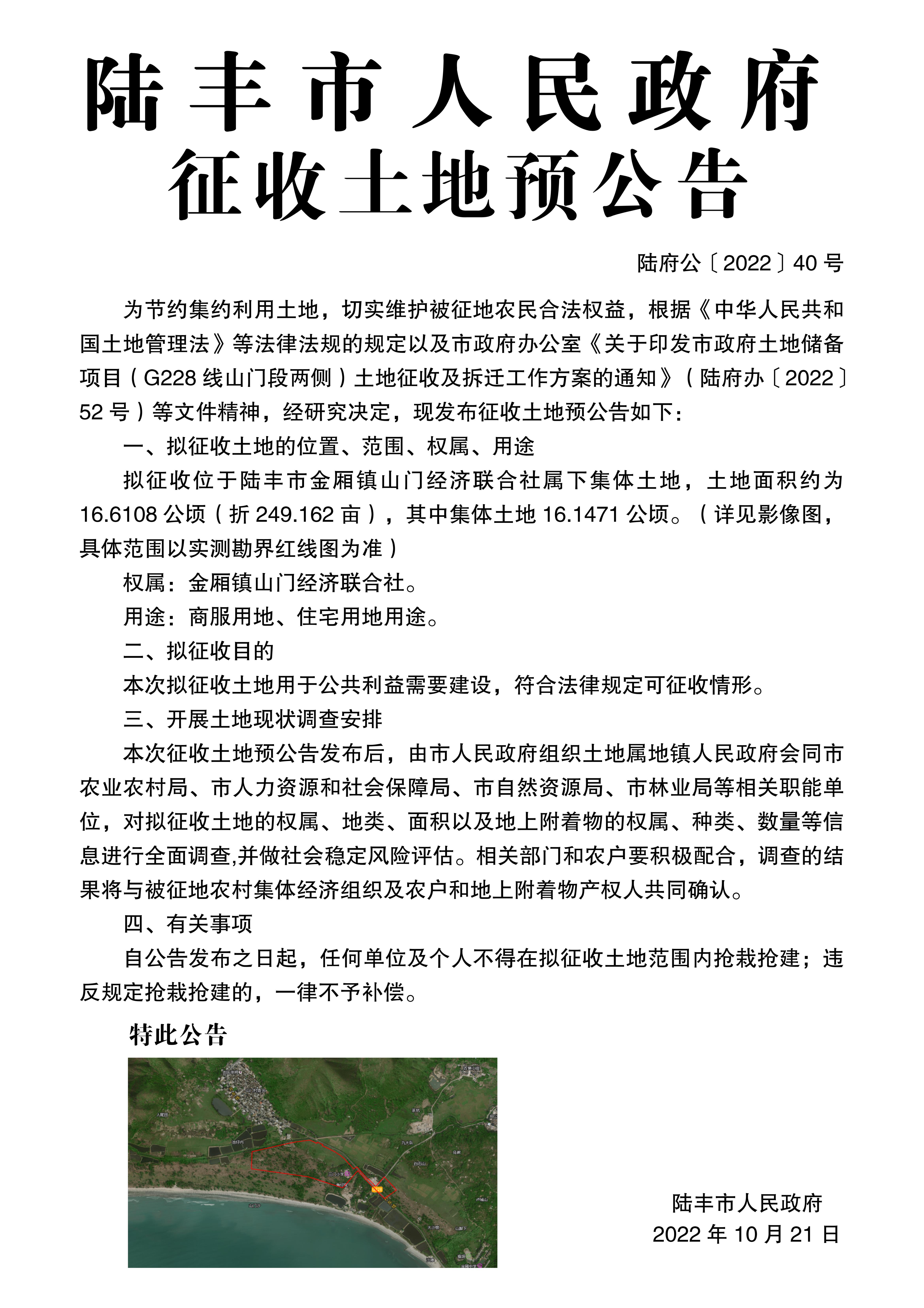 陸豐市人民政府征收土地預(yù)公告(陸府公[2022]40號(hào))