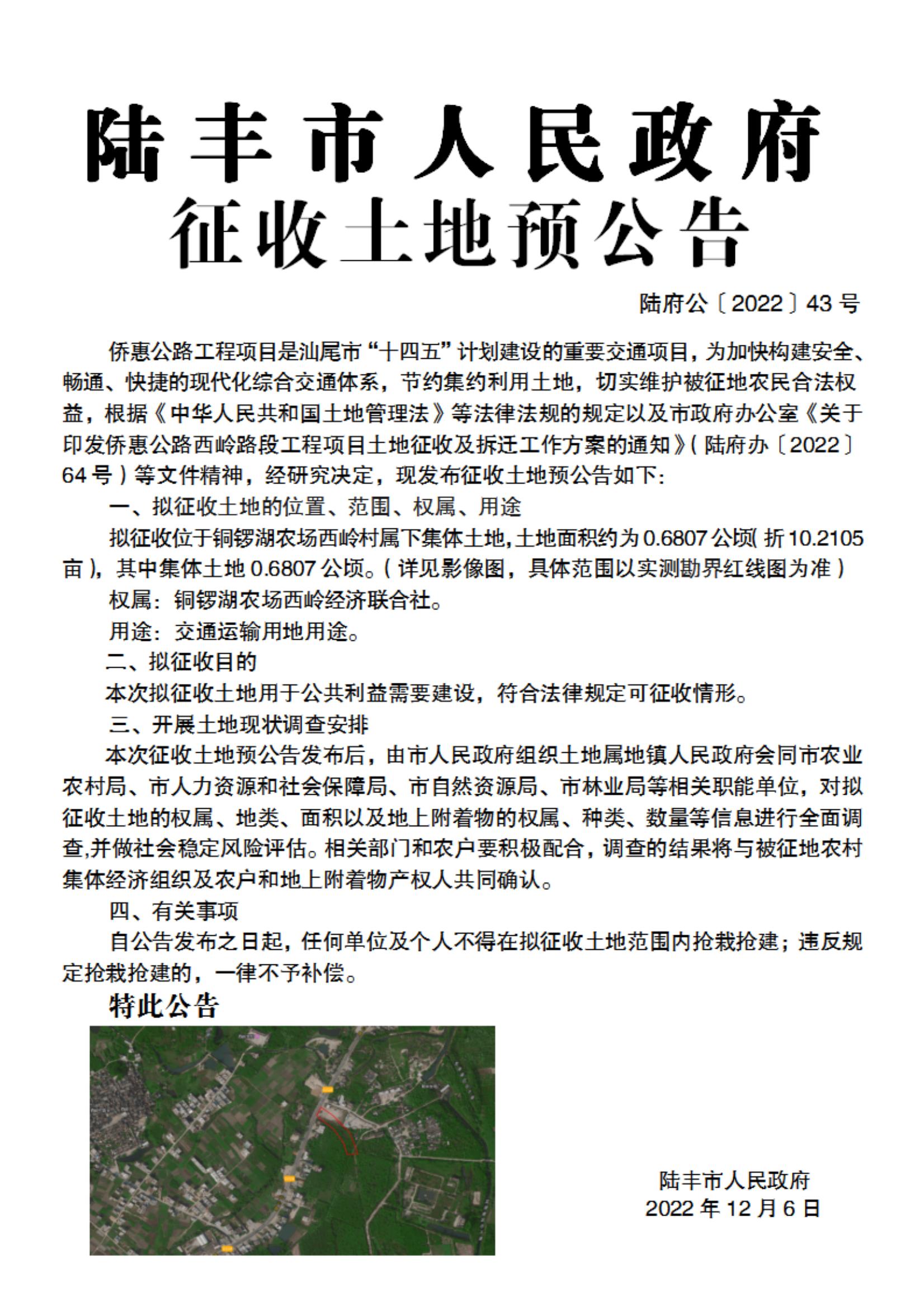 陸豐市人民政府征收土地預(yù)公告(陸府公[2022]43號(hào))