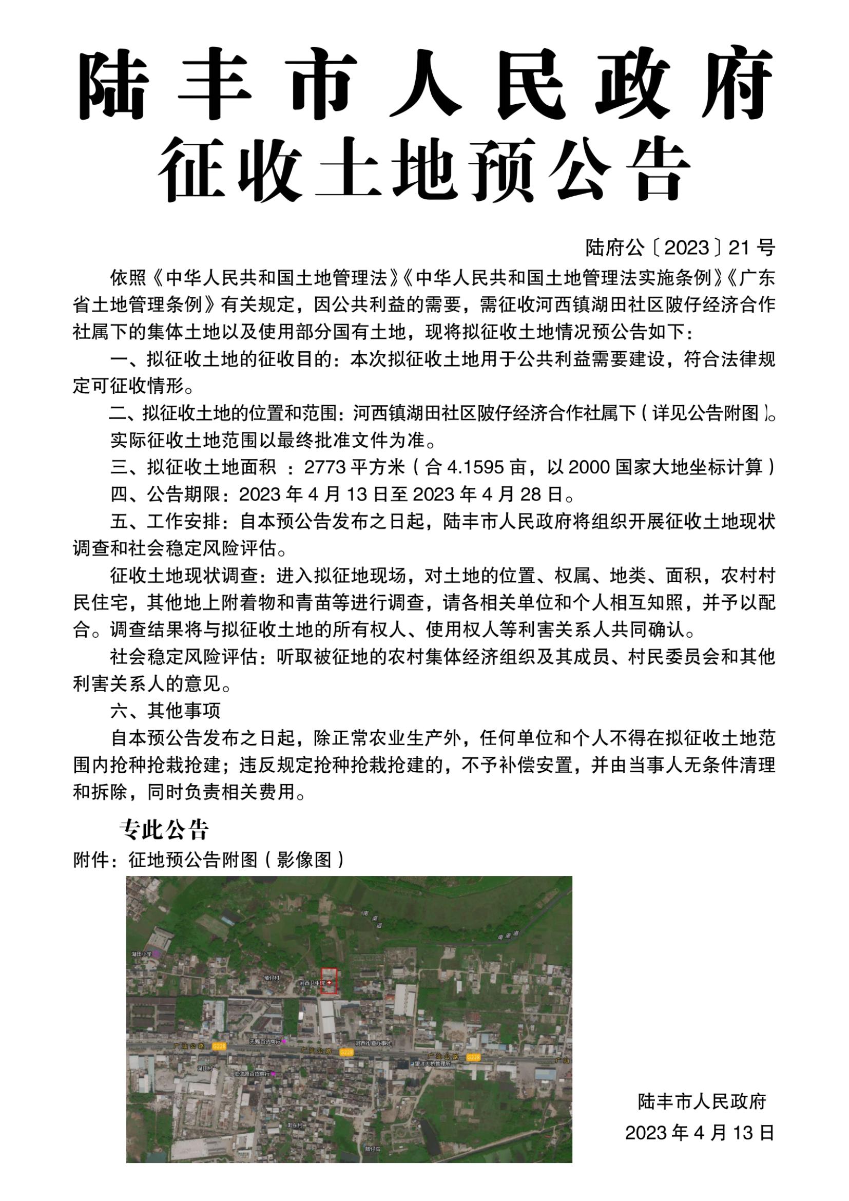 陸豐市人民政府征收土地預(yù)公告(陸府公〔2023〕21號)