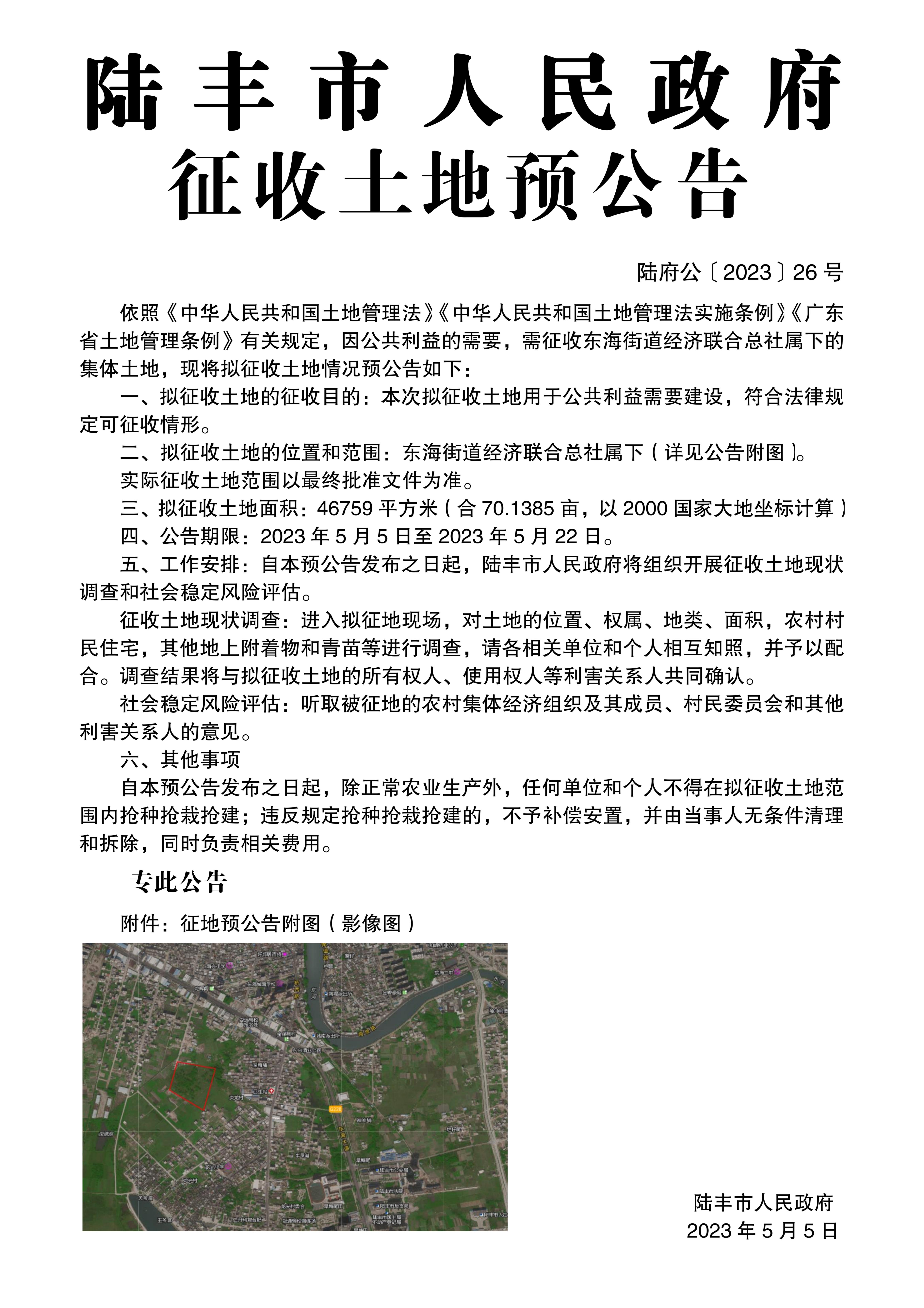 陸豐市人民政府征收土地預(yù)公告(陸府公〔2023〕26號)