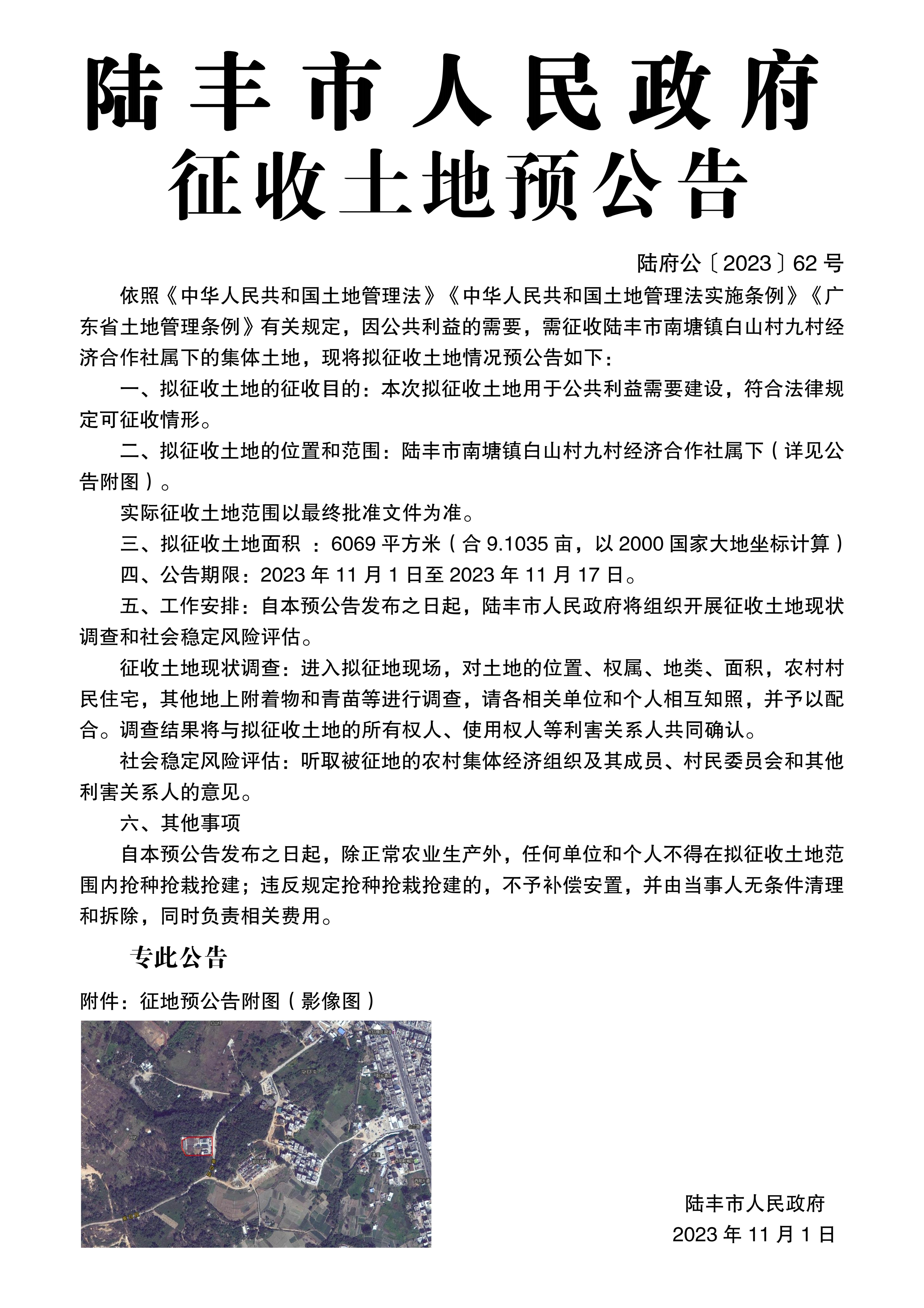 陸豐市人民政府關于征收土地預公告(陸府公〔2023〕62號)