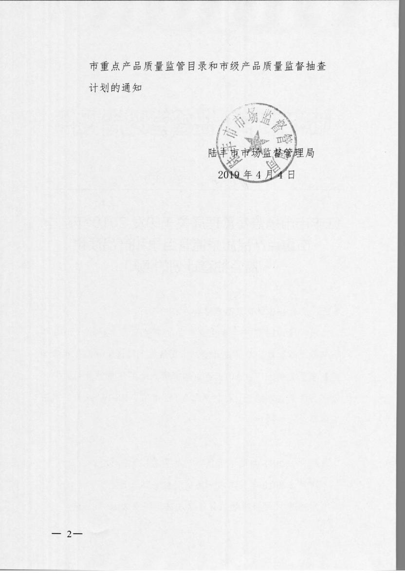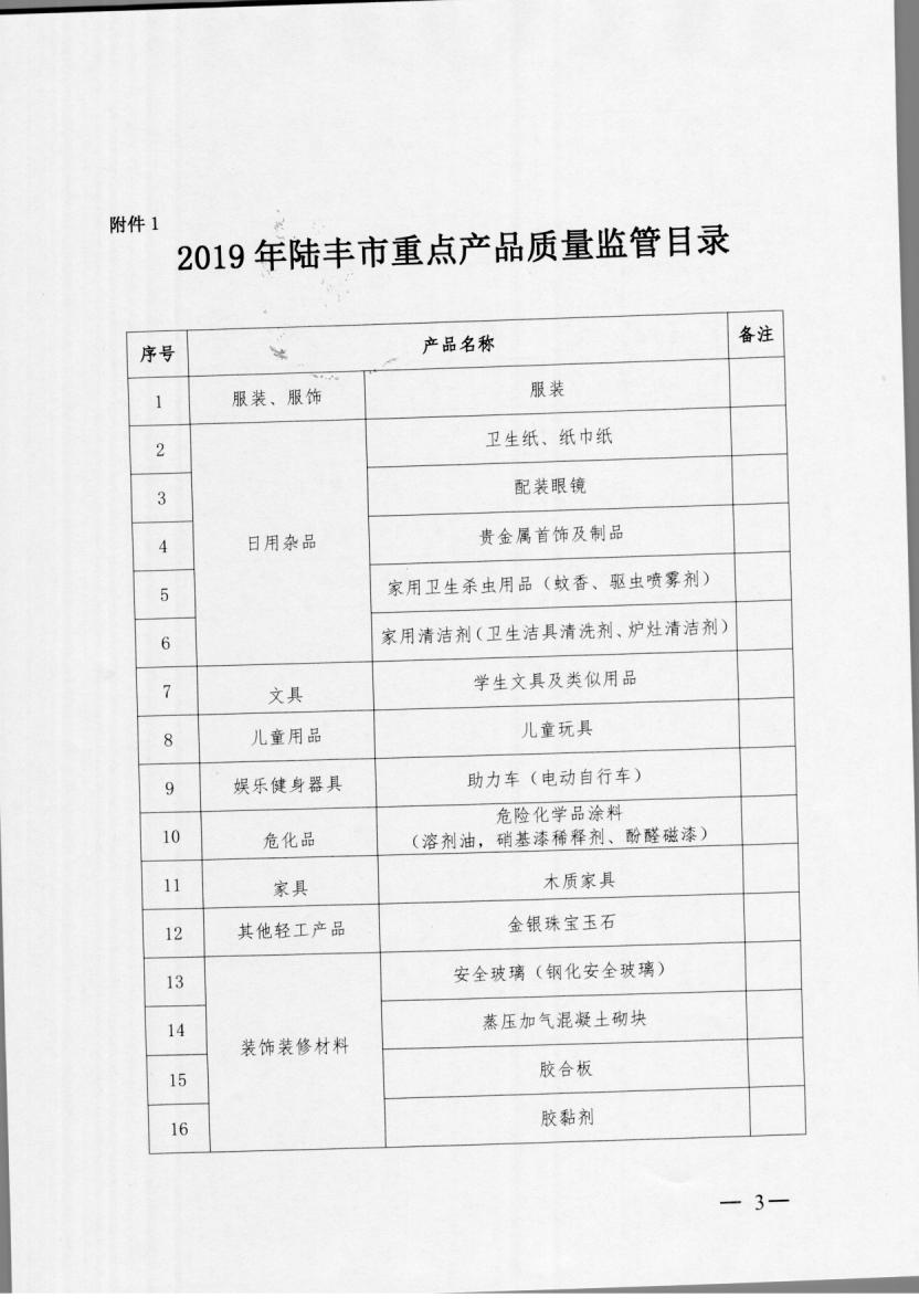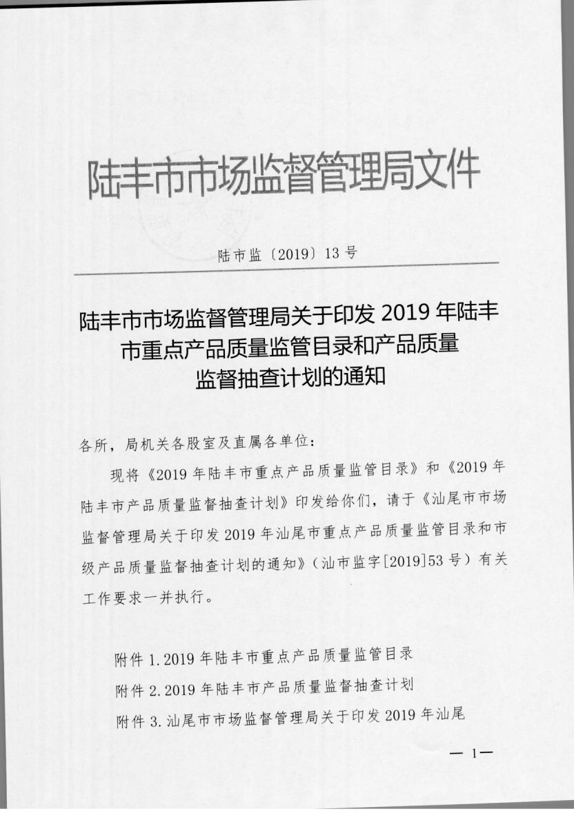 關(guān)于印發(fā)2019年陸豐市重點產(chǎn)品質(zhì)量監(jiān)管目錄和產(chǎn)品質(zhì)量監(jiān)督抽查計劃的通知