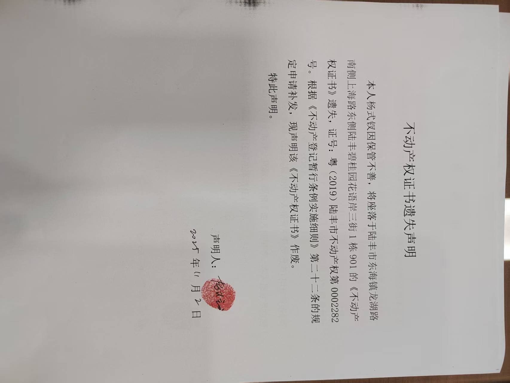 遺失聲明:本人楊式釵因由于保管不善,將座落于陸豐市東海鎮(zhèn)龍湖路南側(cè)上海路東側(cè)陸豐碧桂園花語岸三街1棟901的《不動產(chǎn)權(quán)證書》遺失,證號:粵(2019)陸豐市不動產(chǎn)權(quán)第0002282號。根據(jù)《不動產(chǎn)登記暫行條例實施細則》第二十二條的規(guī)定申請補發(fā),現(xiàn)聲明該《不動產(chǎn)權(quán)證書》作廢。
