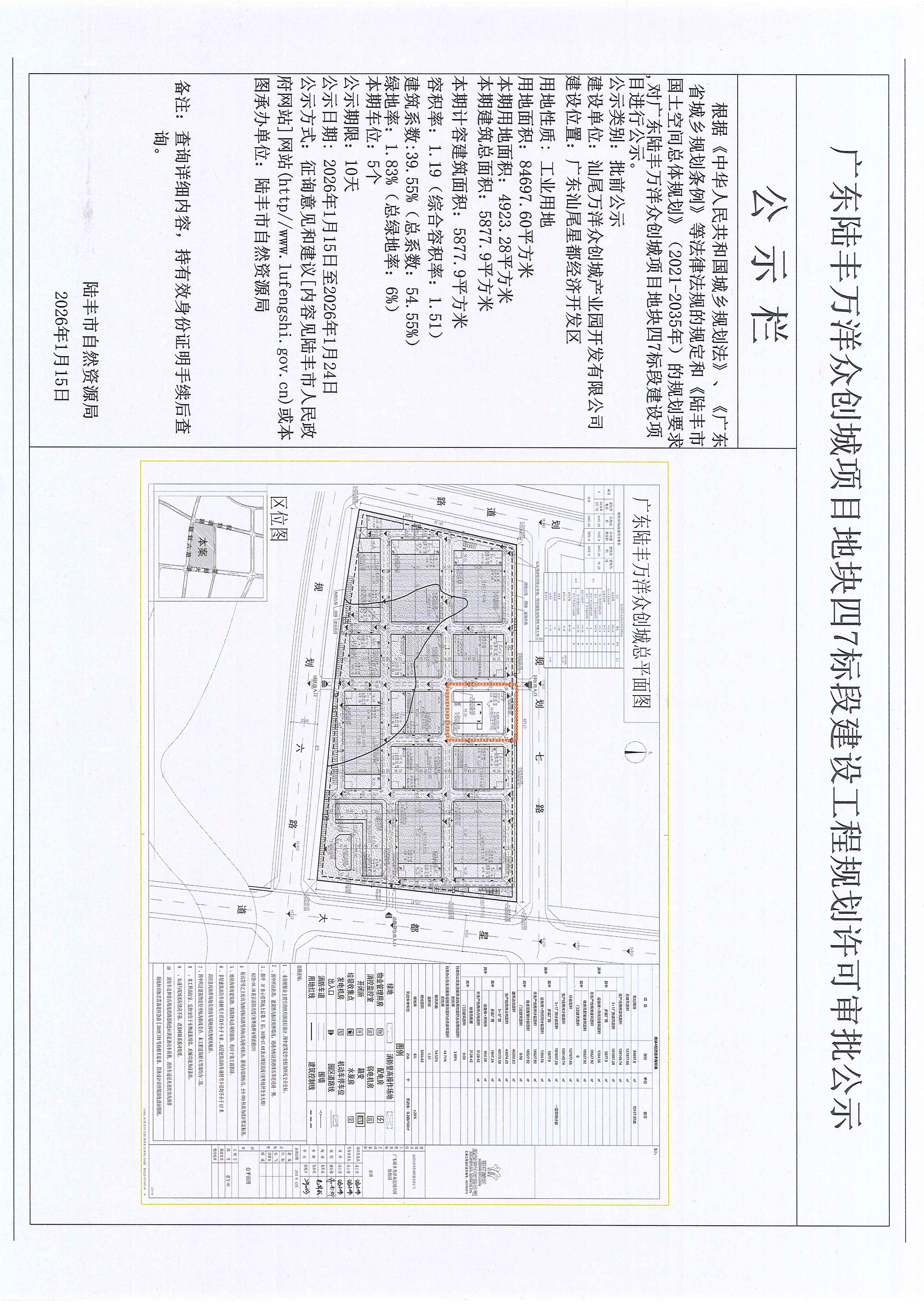 廣東陸豐萬(wàn)洋眾創(chuàng)城項(xiàng)目地塊四7標(biāo)段建設(shè)工程規(guī)劃許可審批公示