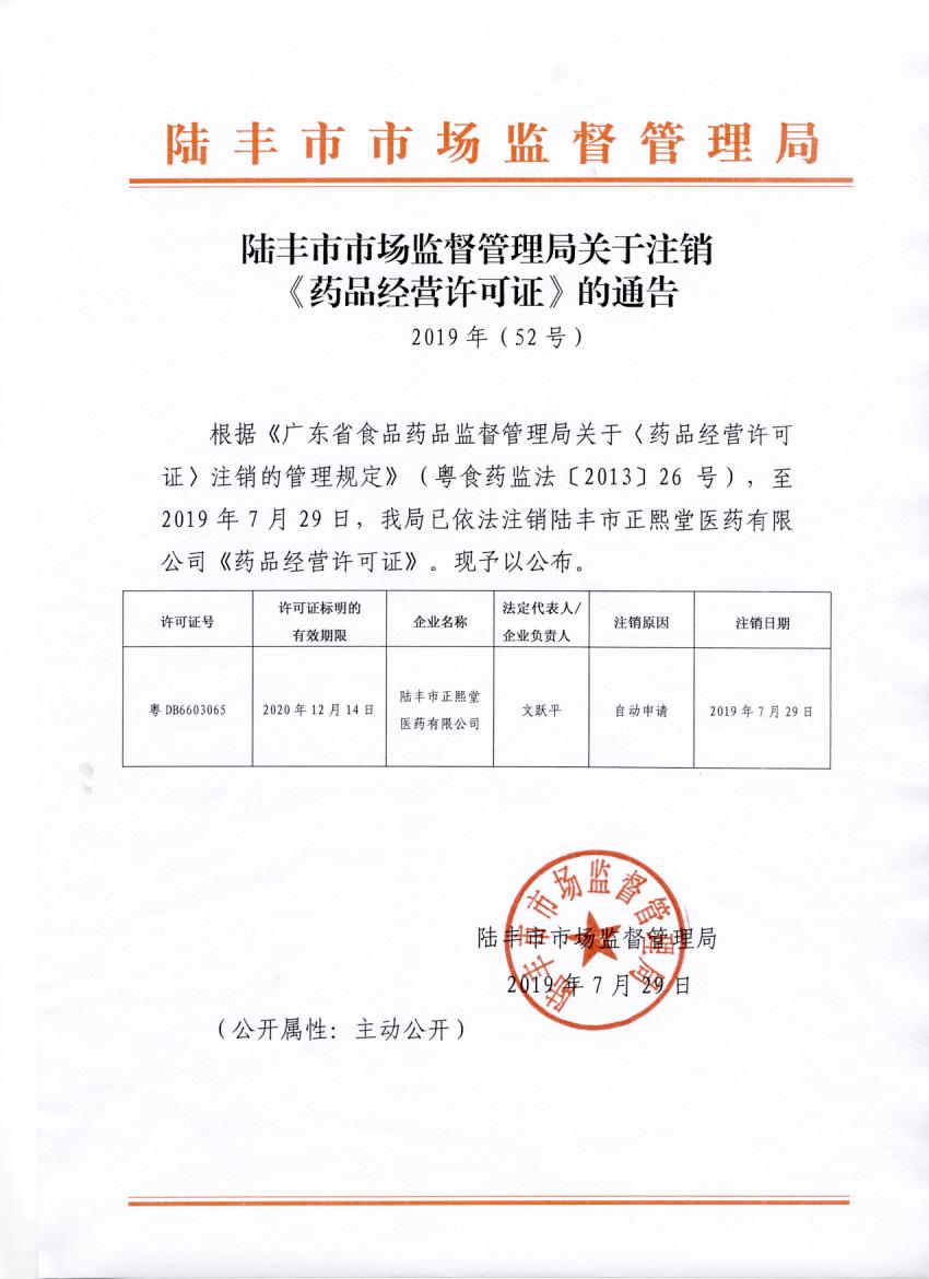 關(guān)于注銷《藥品經(jīng)營許可證》的通告(2019年52號)