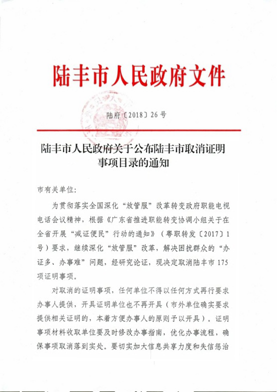 陸豐市人民政府關(guān)于公布陸豐市取消證明事項(xiàng)目錄的通知